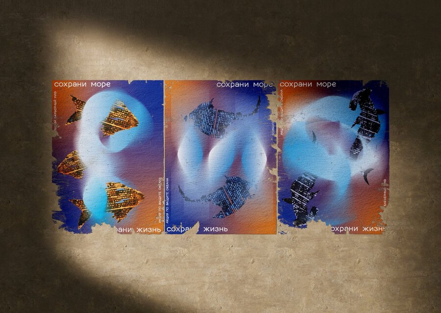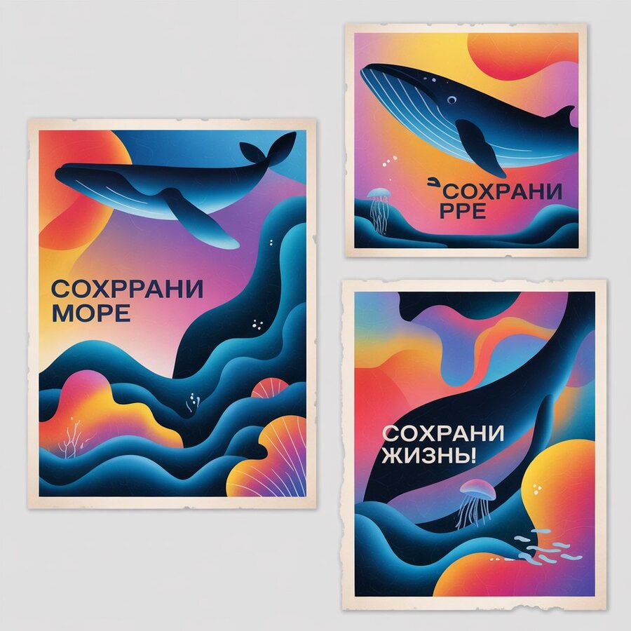 eco awareness posters design about protecting the ocean, abstract marine theme, bold gradient colors in blue, violet, orange and red tones, smooth organic shapes resembling sea waves and marine creatures, textured paper surface with torn edges, slightly weathered and vintage look, minimal typography in Russian «сохрани море» and «сохрани жизнь», futuristic yet natural composition, surreal lighting, high-quality design, contemporary graphic poster style. there should be 3 posters