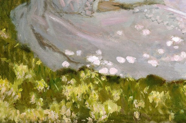 Благодаря ярким солнечным зайчикам чувствуется, что картина изображает тёплое время года. Художник изображает лучи света, пробивающиеся сквозь листья пятнами. «Моне уделяет особое значение не только свету, но и цвету: на траву блики ложатся салатовыми, где-то даже почти лимонными пятнами, а на платье — нежно-розовыми.» [9]