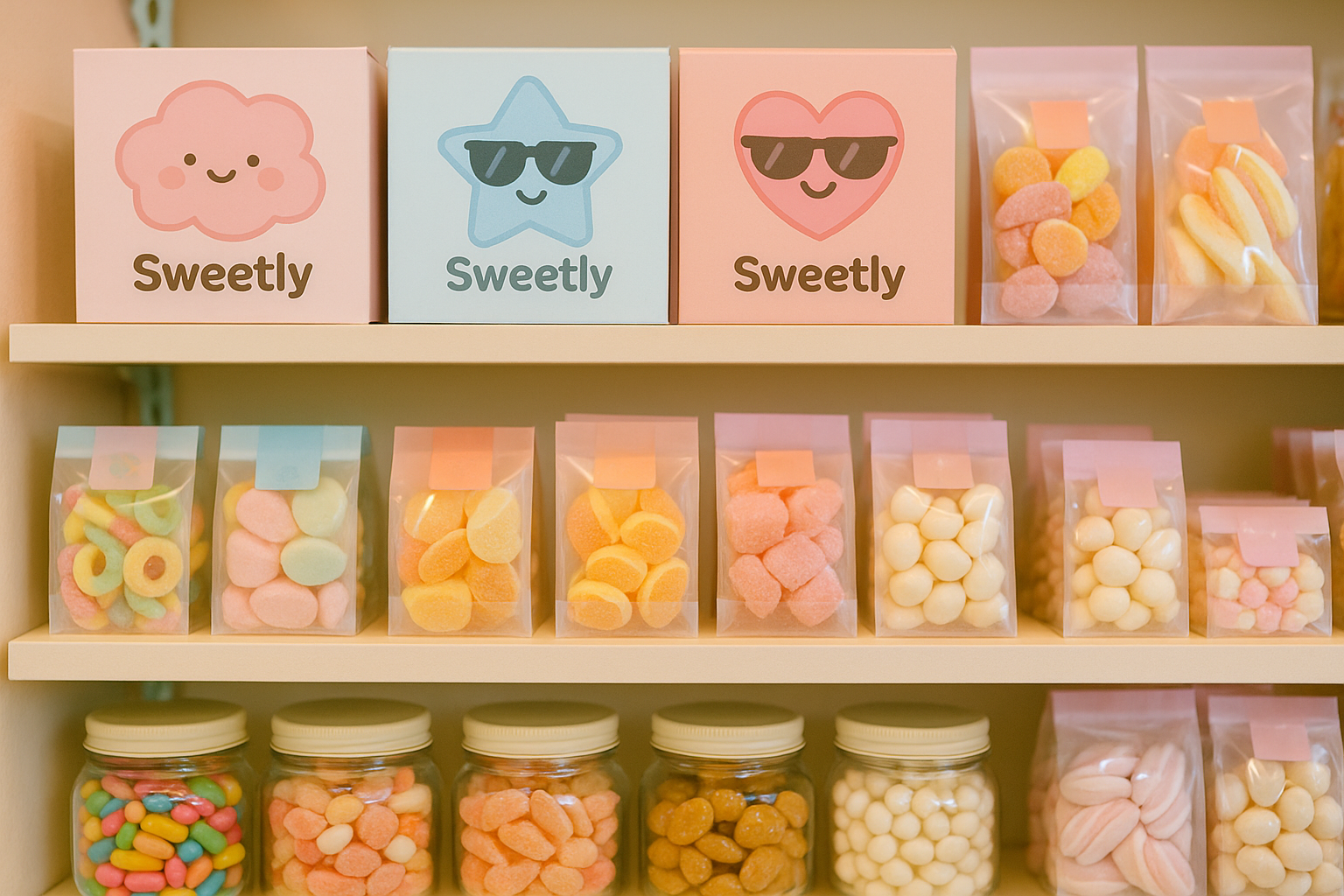 3. Сделай реалистичную генерацию полок с конфетами поближе, на коробках/упаковках должно быть изображение с одним маскотом, все должно быть в пастельных тонах.