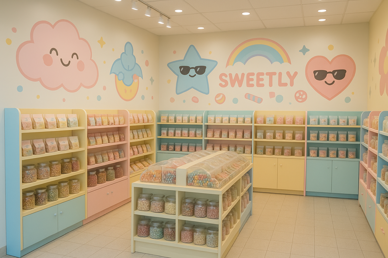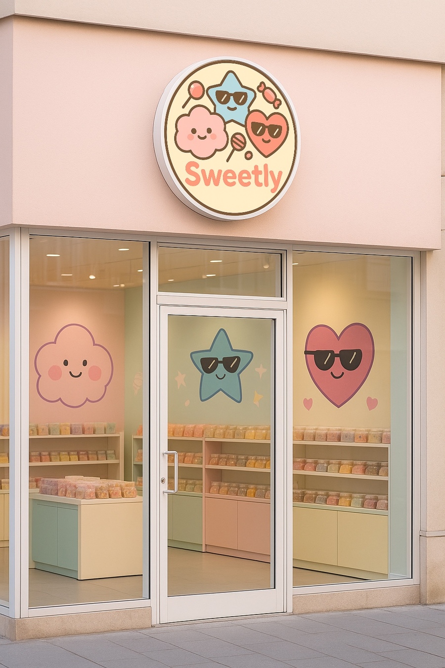 1. Сделай реалистичную генерацию как бы выглядел магазин сладостей Sweetly снаружи. Наружные стены магазина должны быть прозрачными. Внутри мы видим полки со сладостями и стены с изображением ранее перечисленных маскотов. Снаружи сверху висит ранее сгенерированное лого, все должно быть в пастельных тонах.