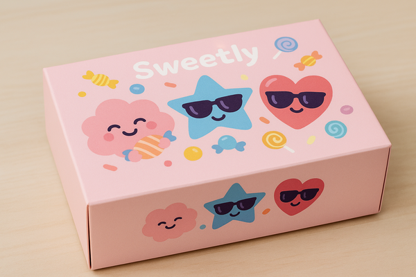 Сгенерируй розовую коробку с конфетами на которой изображены 3 маскота — розовое облачко, синяя звезда в солнцезащитных очках и розовое сердце в солнцезащитных очках