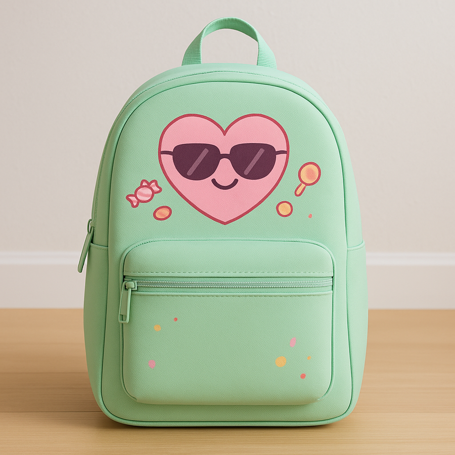 3. Сгенерируй похожий рюкзак только зеленого цвета и с розовым сердцем в солнцезащитных очках.