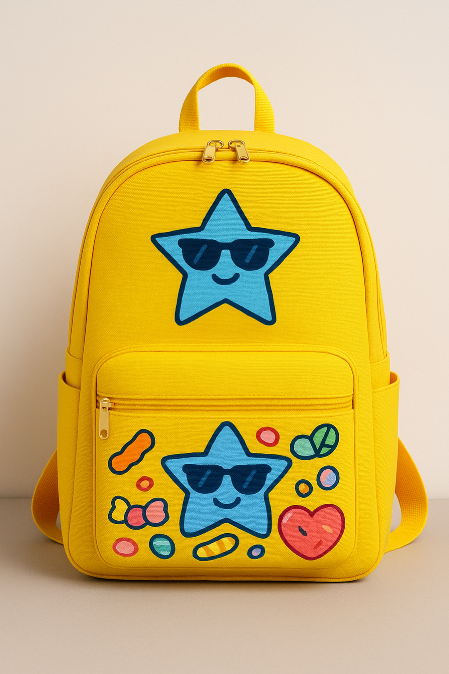 2. Сгенерируй похожий рюкзак только желтого цвета и с синей звездой в солнцезащитных очках среди конфет.