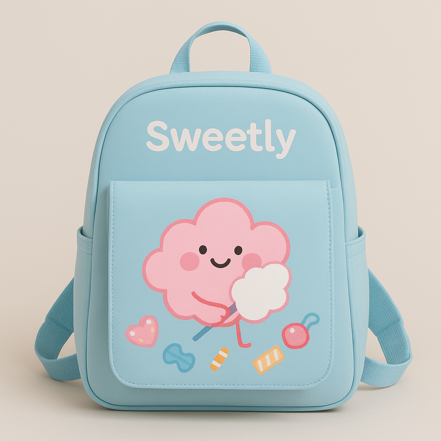 1. Сгенерируй портфель светло синего цвета с изображённым на ним розовым облачком держащим белую сахарную вату.