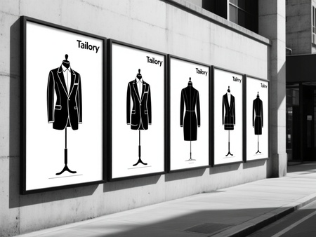 Промт: Generate a series of black and white poster concepts for the brand «Tailory,» designed to be displayed as outdoor advertisements. The posters should convey the essence of bespoke tailoring and perfectly fitted garments through striking, minimalist imagery.