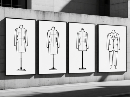 Each poster, depicted as if mounted on an urban street or a minimalist exterior wall, should feature a full-body mannequin presented as clean, precise line art drawn in black on a pure white background. The mannequin should be the sole or primary focus, with sharp lines and defined contours that emphasize its form and the concept of precise tailoring. Subtle elements of the outdoor environment should be visible, such as a hint of building texture, a suggestion of ambient light (even in B& W), or a slight shadow cast by the poster itself.