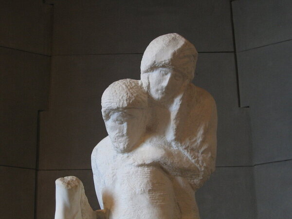 «Пьета Ронданини» (1552–1564 гг., Музей Пьеты, Милан): последняя работа мастера, доведенная до предельной абстракции. Фигуры Христа и Марии истончены, они сливаются в едином вертикальном порыве боли и духовного слияния. Отказ от анатомической детализации в пользу передачи чистой эмоции страдания показывает эволюцию искусства Микеланджело от физического драматизма к экзистенциальному и духовному.
