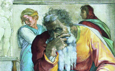 Фигуры пророков, обрамляющие центральные сцены, являются примерами глубокого индивидуального драматизма. Иеремия сидит, погруженный в тяжелую меланхолию, его поза скручена, голова опущена, выражение лица полно скорби.