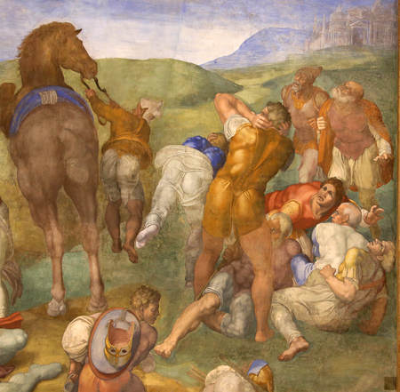 Здесь Микеланджело использует плотную композицию и анатомическое мастерство для передачи физического и эмоционального ужаса. Каждая фигура — это отдельная история страдания, которые вместе создают мощный, подавляющий эффект всеобщего бедствия.