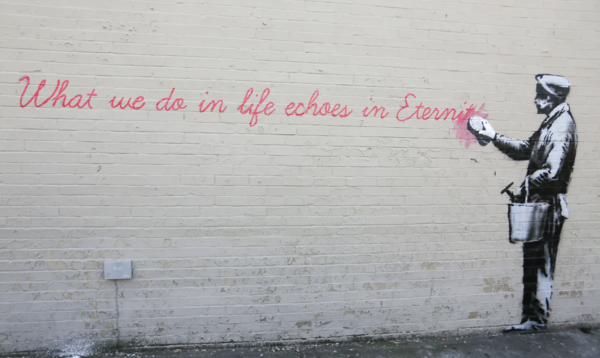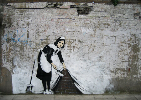 Banksy’s 'Sweeping It Under The Carpet' is seen in London, England on May 16, 2006. Banksy’s 'What we do in life echoes in Eternity' seen in New York City on Oct. 14, 2013.