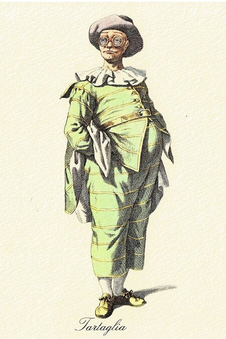 Тарталья — слуга, страдающий от заикания, часто изображается как персонаж с нервным и забавным поведением. Он преданный и добродушный, но иногда проявляет нелепость в своих действиях.