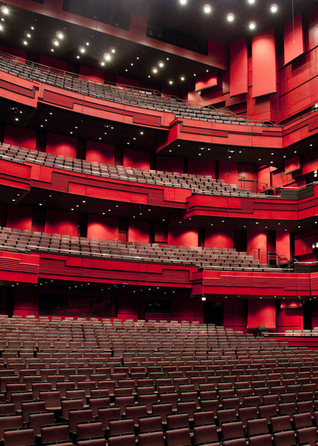 В XX веке театр переживает радикальное переосмысление. Модернизм отвергает декоративность предыдущих эпох, делая акцент на функциональности, чистоте формы и конструктивной логике. Театральные здания становятся более строгими, геометричными и технологичными. Бетон, стекло и сталь формируют новый визуальный язык, а пространство создаётся не ради украшения, а ради идеальной акустики, комфортной видимости и гибкости сцены. Появляется тип «black box» — универсальный тёмный зал, в котором можно перестраивать конфигурацию зрителей и сцены в зависимости от постановки. Театр становится лабораторией, а не дворцом.