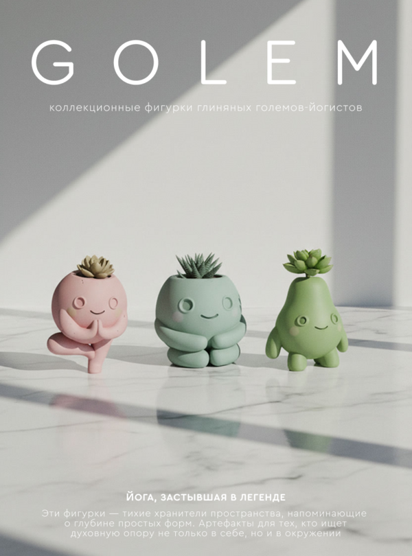 GOLEM — бренд фигурок с големами-йогистами. Каждая фигура отражает философию позы в йоге. В них миф встречает медитацию: грубая мощь глины обретает гармонию в плавных асанах. Это баланс камня и дыхания, сила, застывшая в осознанном покое.