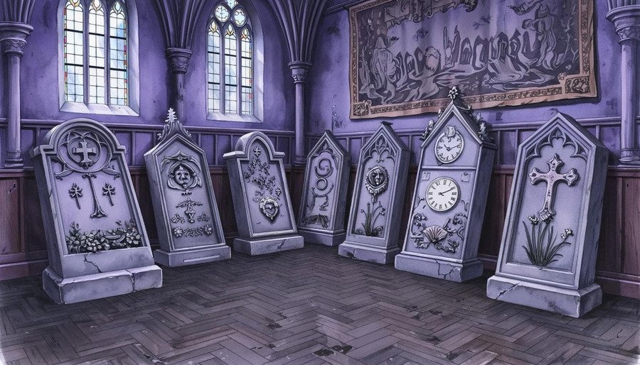 Могильные плиты готической архитектуры, лежащие в похоронном бюро, в 2D нарисованном стиле