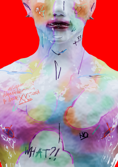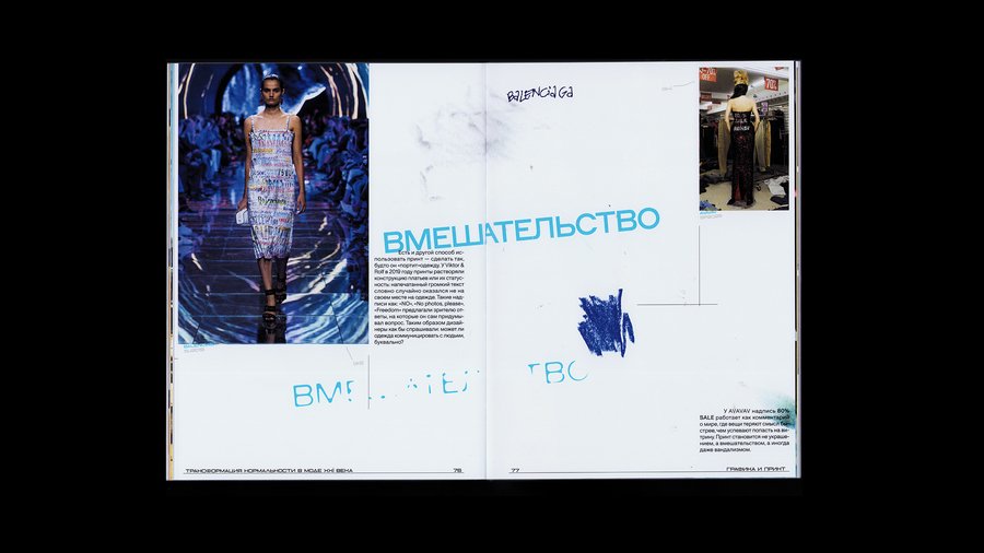Обложка с разрисованным телом, покрытая тканью, отсылает к абсурду в моде и метафорически показывает стремление индустрии выйти за пределы однообразия.