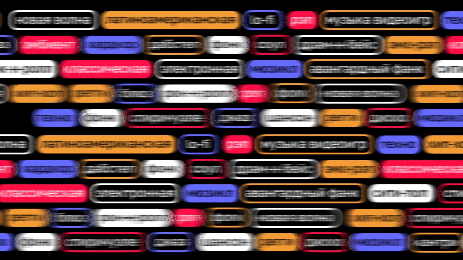 Advertising materials feature genre tags [e.g., rock and roll, jazz, lo-fi] presented as distinct, colored, and often oval or rounded elements. This reinforces the core mechanism of the app [matching by music] and adds a functional, organized layer to the visual chaos.