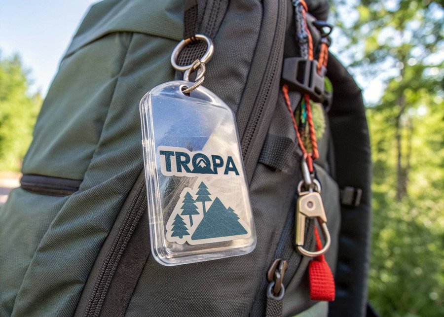 prompt: Create a keychain for Tropa, a brand of eco-friendly, modular outdoor gear, using the brand’s colors and logo. The keychain hangs on a traveler’s backpack, with a close-up of the backpack and keychain. It is designed in the brand’s style and features the logo or graphics. The keychain is made of transparent plastic and features an image. The keychain is attached to the backpack with a small hiking carabiner. Small additional brand-inspired elements hang on strings, complementing the keychain. The keychain is the focal point of the image, and the background is realistic.