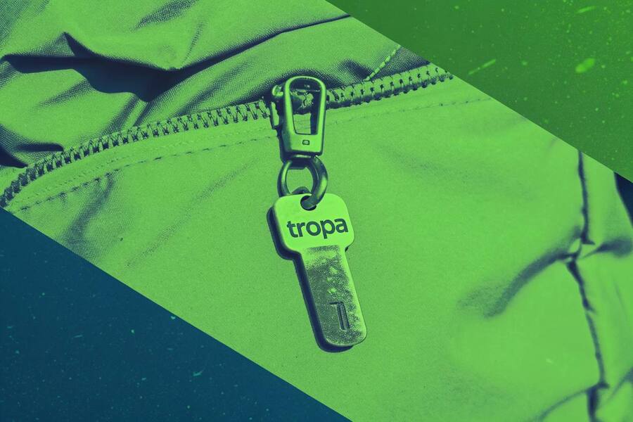 prompt: Generate a minimalist and modern logo for the Tropa brand — a brand of eco-friendly hiking gear that you can customize to your preferences thanks to its modular design. It should feature one accent color, the others muted, a total of three colors, and should evoke associations with nature, fashion, modernity, and technology.