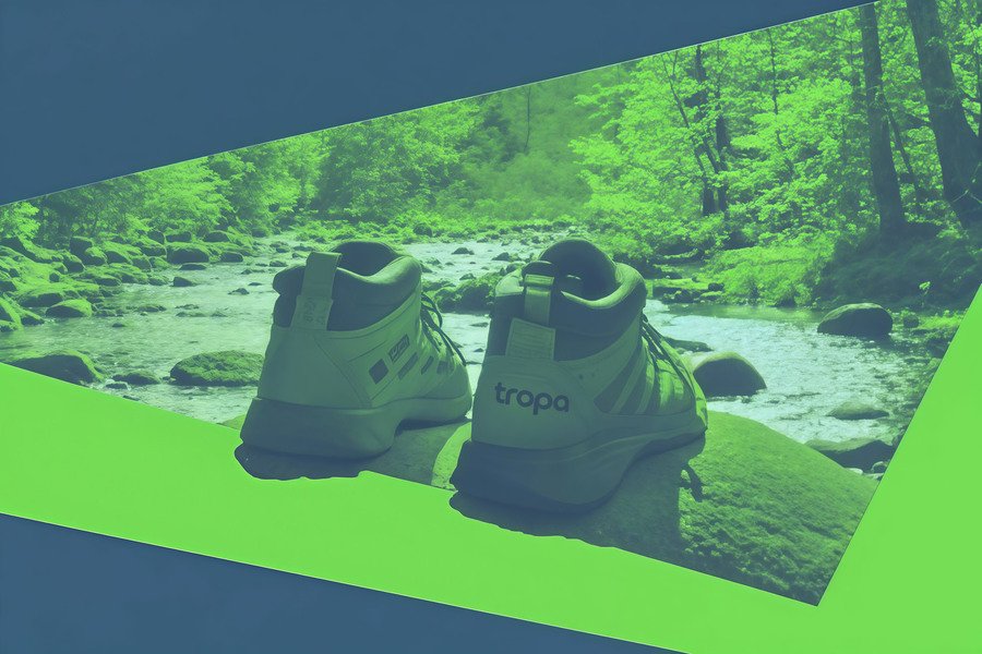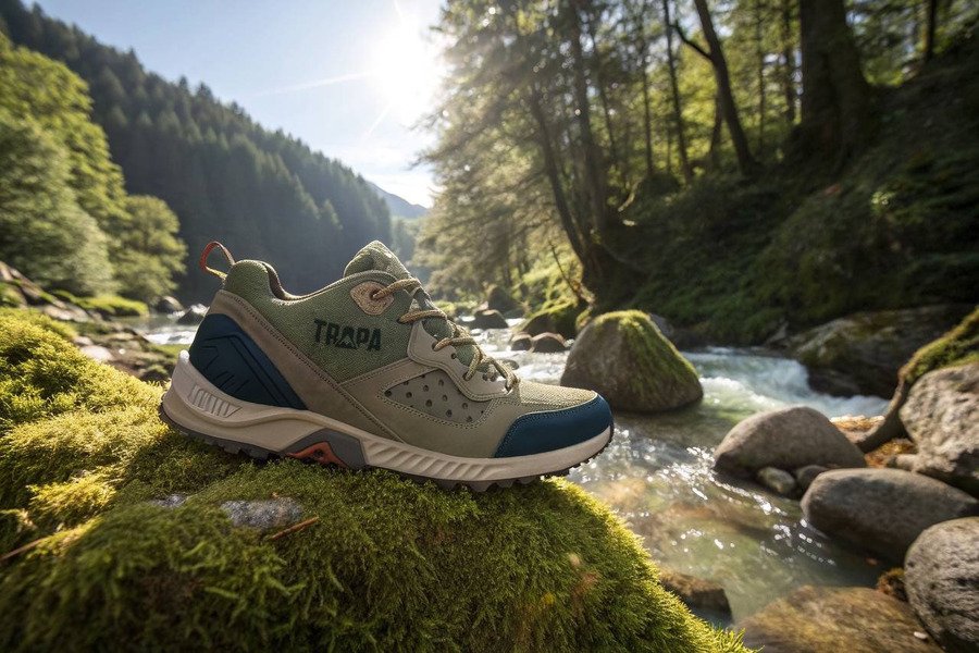 prompt: A dynamic, professional product shot of a pair of modern hiking sneakers from the Tropa brand. They are sitting on a mossy rock by a clear forest stream. The sneakers are in brand tones (dark blue and green), made from recycled materials with a vibrant sole. The Tropa logo is visible on the side. The environment is lush and green, with sun rays filtering through the trees. Highly realistic, commercial photography style.