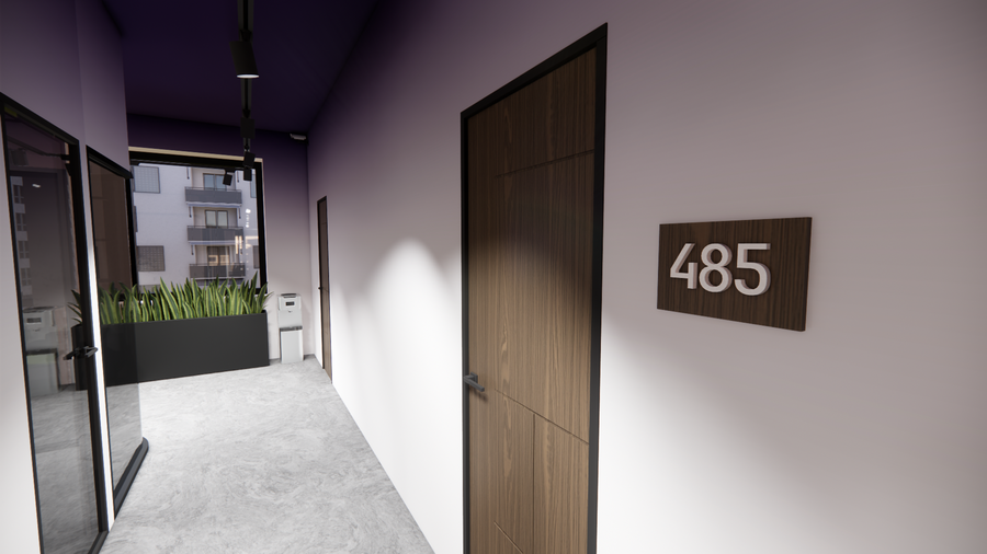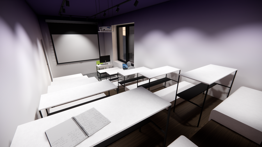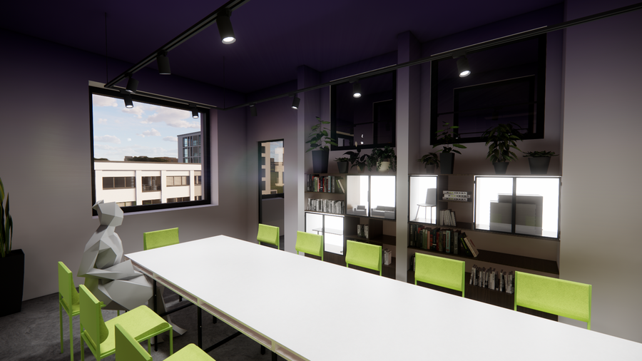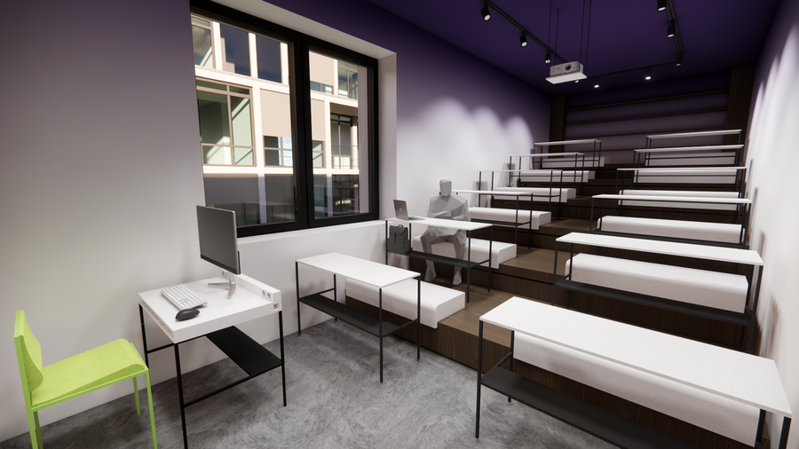 Несмотря на сложный исходный план с несущими колоннами и столбами посреди помещения, в моем проекте мне удалось уместить все, о чем просили студенты и преподаватели.