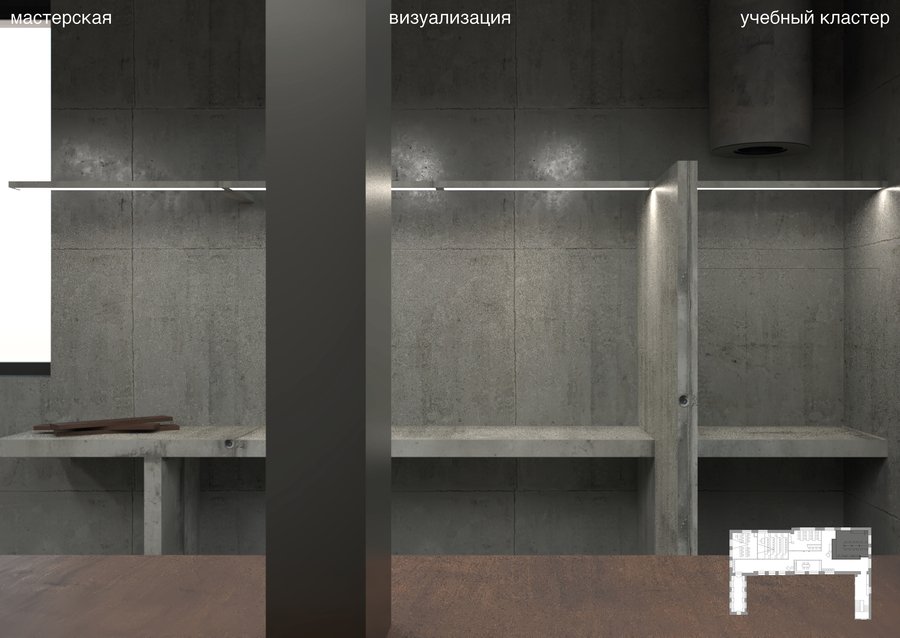 - Концепция - Референсы - Мудборд - План - Аксонометрия плана - Визуализации - Варианты деталей - Ссылка на клаузуру