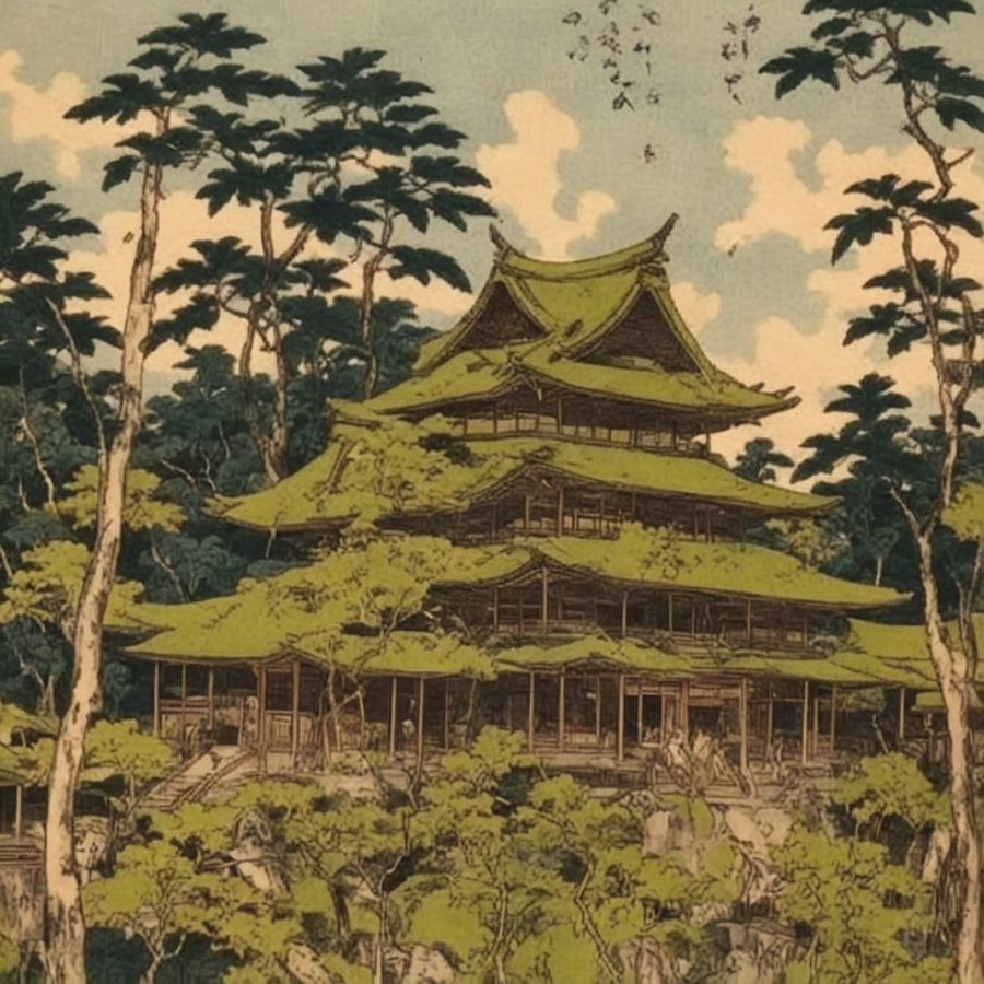 промт: «photo collage in UKIYE EH style, An old, moss-covered stone temple hidden deep in a lush, sunlit forest»
