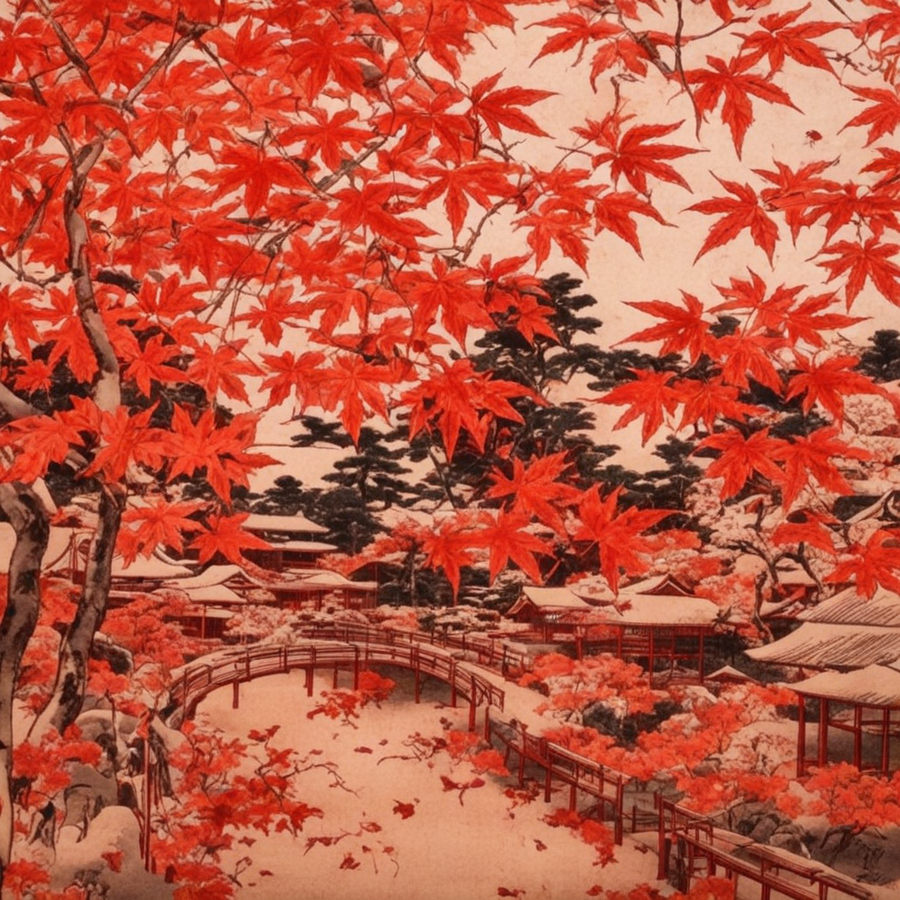 «photo collage in UKIYE EH style, A serene Japanese garden» «photo collage in UKIYE EH style, A dynamic shot of a dancer in a vibrant, flowing kimono spinning with a large.»
