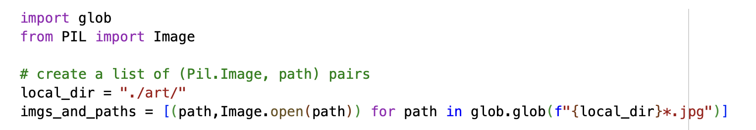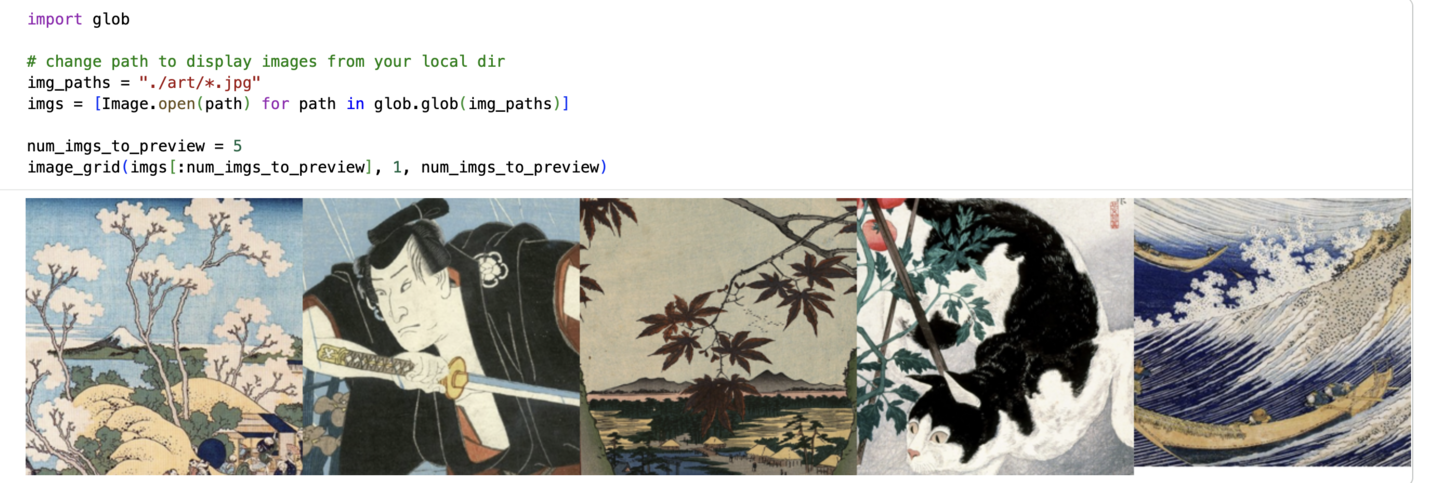 1. Загружает изображения из указанной папки (./art/), находя все файлы с расширением .jpg. 2. Создает и отображает сетку из первых 5 найденных изображений, масштабируя их до 256×256 пикселей и располагая в одну строку для удобного предпросмотра.