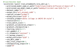 1. Загружает и подготавливает базовую модель Stable Diffusion XL вместе с оптимизированным VAE для последующей генерации изображений. 2. Запускает обучение LoRA на вашем датасете с параметрами: