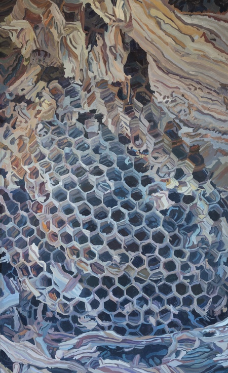 Работы говорят и о цикличности. Осиное гнездо — не конечный пункт, а этап: его материал рассыплется в почву, станет основой для новых форм, как руины античных городов, поглощённые землёй и прорастающие травой. Здесь есть и пластичность восприятия: улей становится метафорой — то ли покинутого города-утопии, то ли анатомического среза, то ли древнего свитка с иероглифами утраченной цивилизации.
