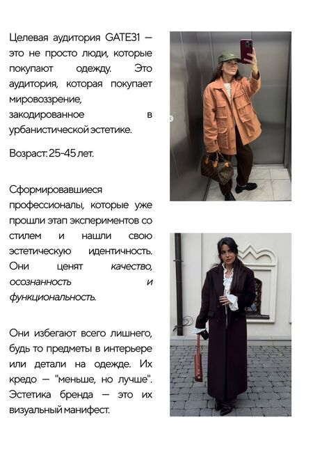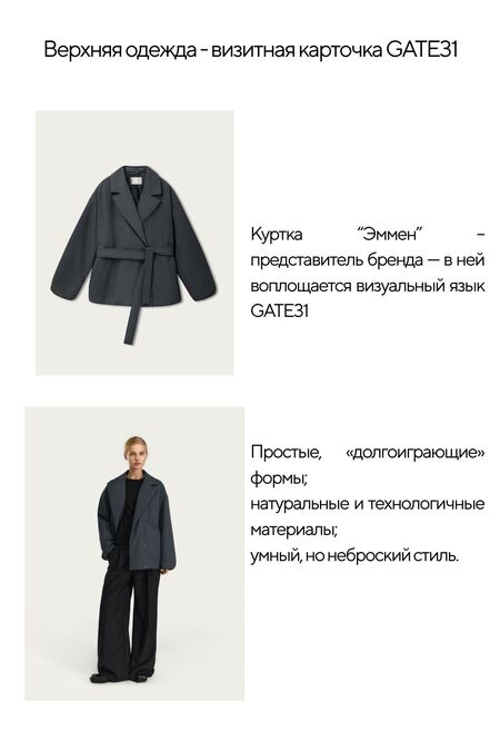 «Для меня GATE31 — комфорт и индивидуальность. Простые силуэты подстраиваются под человека, который покупает вещь. На каждом изделие выглядит по-разному, в минимализме есть индивидуальность, а главное — личность каждого из нас.»