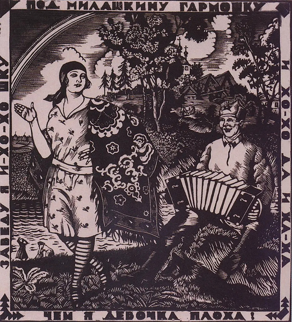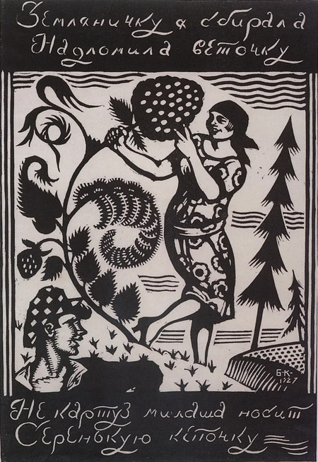 Борис Михайлович Кустодиев «Земляничку я собирала. Из серии гравюр-лубков с текстами народных частушек „Народные картинки“» / «Под милашкину гармошку…» 1927