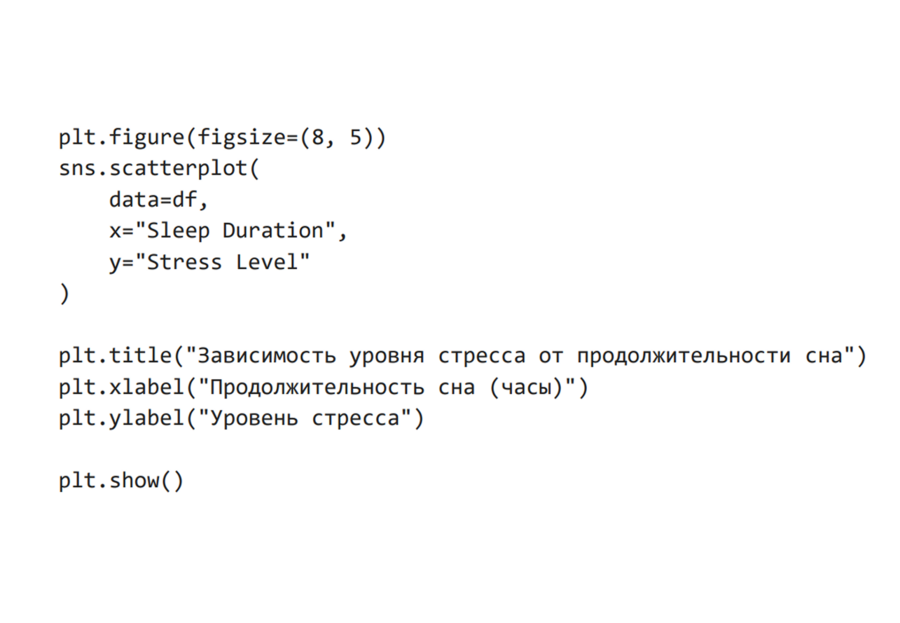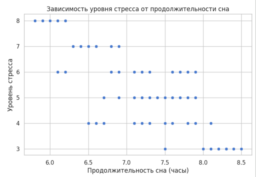 На графике наблюдается обратная зависимость между продолжительностью сна и уровнем стресса. Респонденты с меньшей продолжительностью сна, как правило, демонстрируют более высокий уровень стресса. Это подтверждает значимость сна как одного из ключевых факторов психоэмоционального состояния.