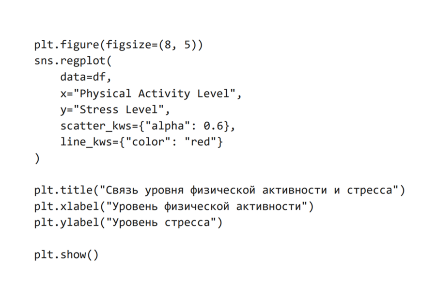 Для анализа взаимосвязи между уровнем физической активности и уровнем стресса был использован диаграмма рассеяния с наложенной линией линейной регрессии. Такой тип визуализации был выбран, поскольку обе переменные являются числовыми и позволяют выявить общий тренд зависимости. Добавление регрессионной линии позволяет наглядно оценить направление и характер связи между показателями.