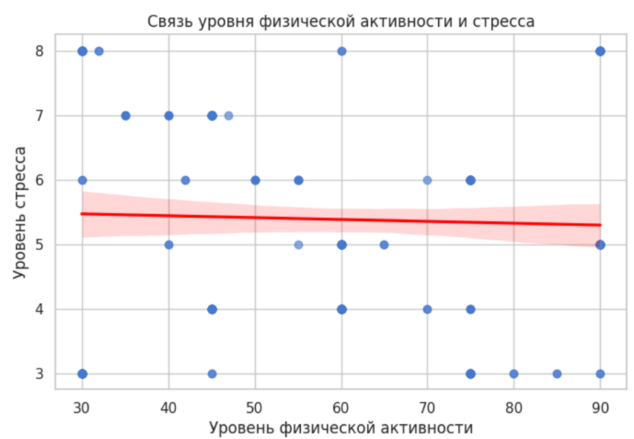 На графике наблюдается слабая отрицательная зависимость между уровнем физической активности и уровнем стресса. В среднем, при увеличении физической активности уровень стресса имеет тенденцию к снижению, однако связь не является строго линейной и характеризуется значительным разбросом значений.