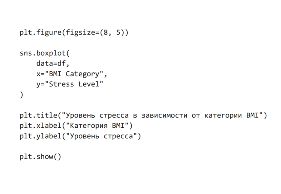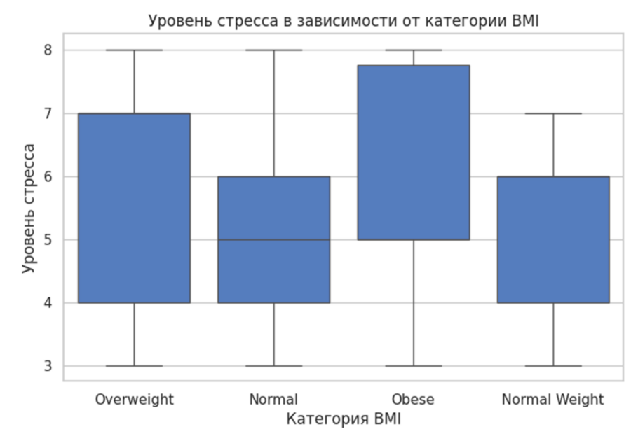 Для анализа различий уровня стресса между категориями BMI была использована ящиковая диаграмма (boxplot), так как она позволяет сравнить распределения числовой переменной между несколькими категориальными группами, а также выявить медианные значения и выбросы. Из графика видно, что уровень стресса различается между категориями BMI. Наиболее высокие медианные значения стресса наблюдаются у респондентов с избыточным весом и ожирением, в то время как у людей с нормальным BMI уровень стресса в среднем ниже.