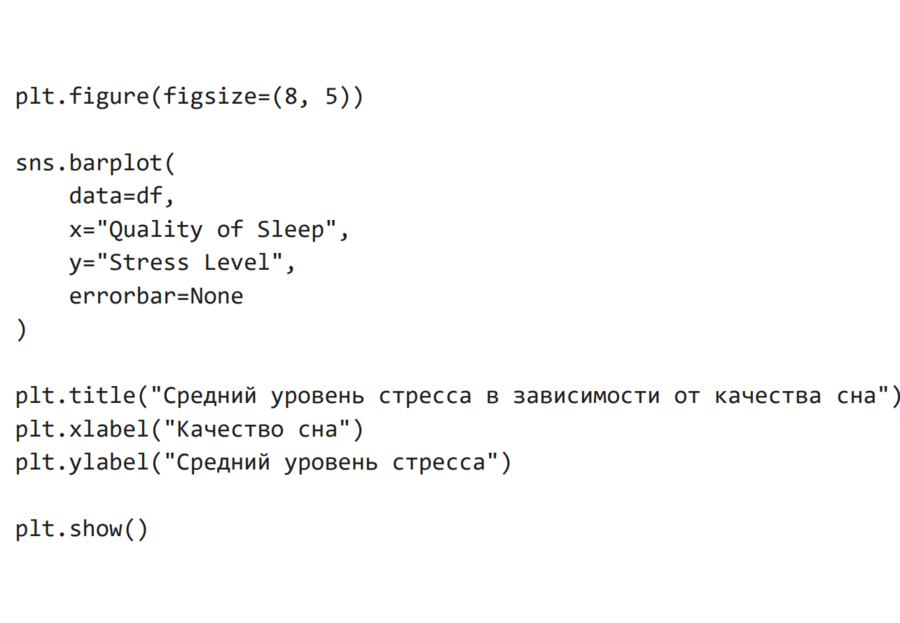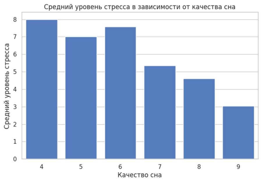 Для анализа зависимости уровня стресса от качества сна была использована столбчатая диаграмма, отображающая средние значения уровня стресса для каждого значения качества сна. На графике наблюдается обратная зависимость между качеством сна и уровнем стресса. С повышением качества сна средний уровень стресса снижается, что подтверждает важную роль сна в психоэмоциональном состоянии человека.