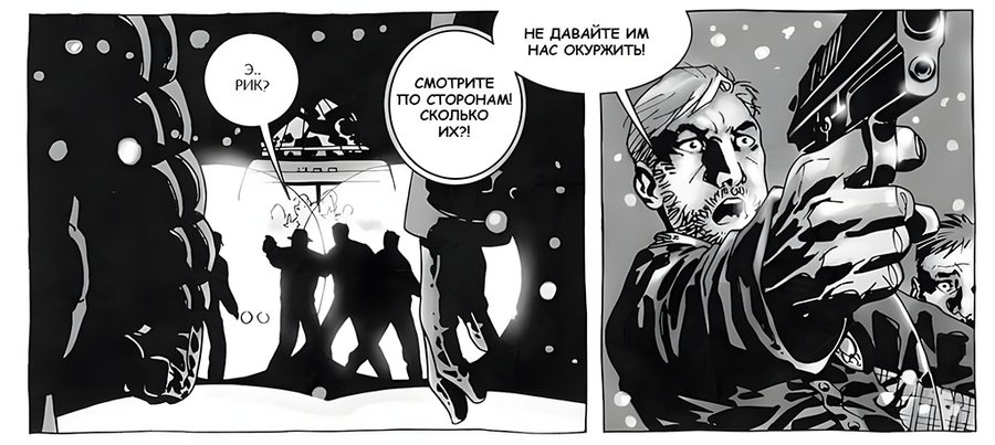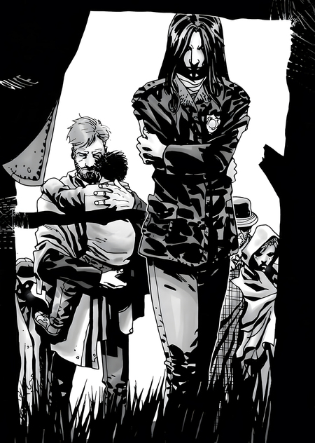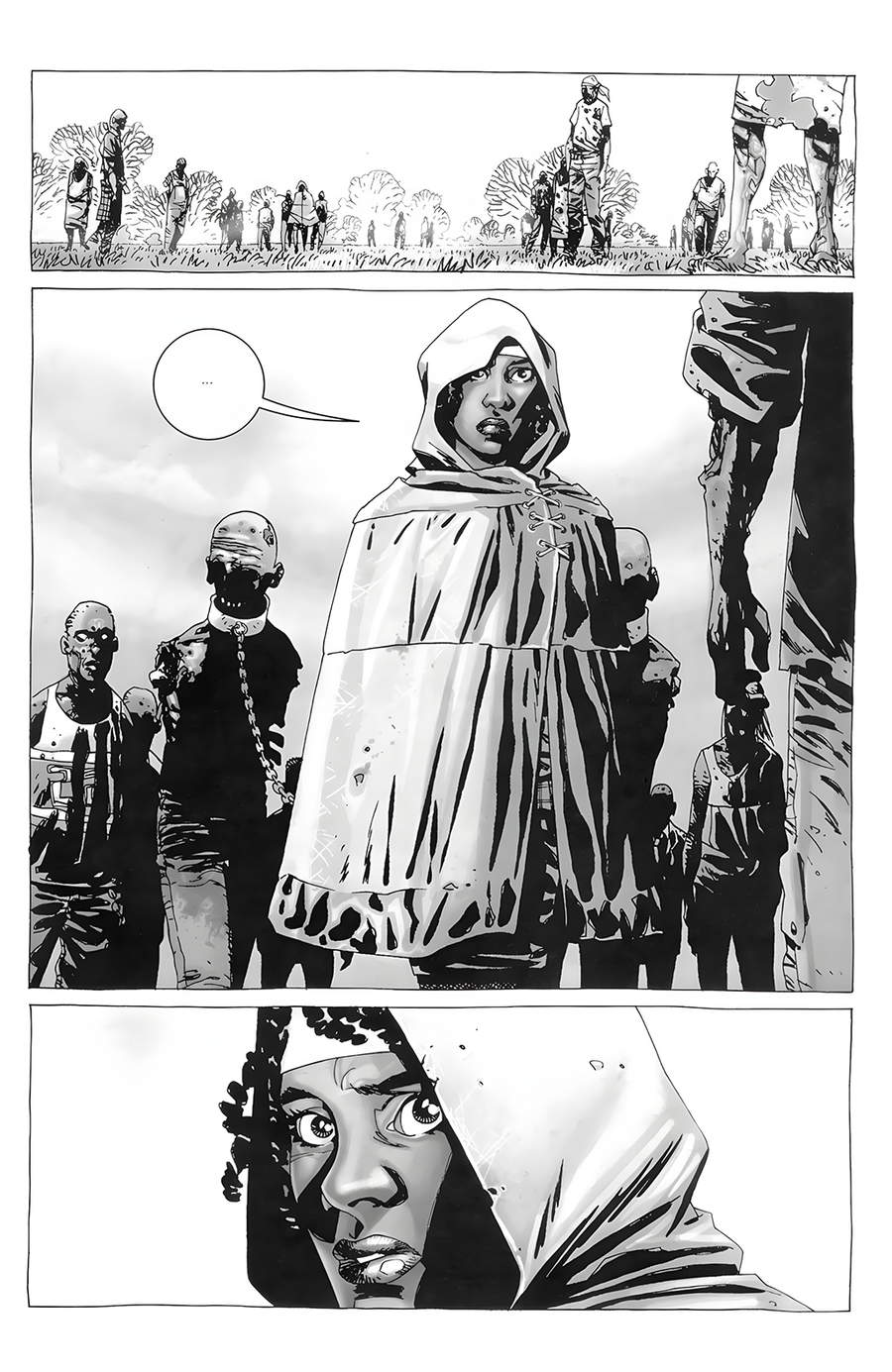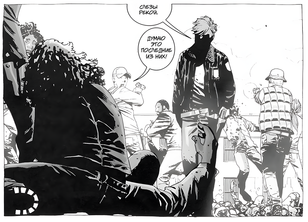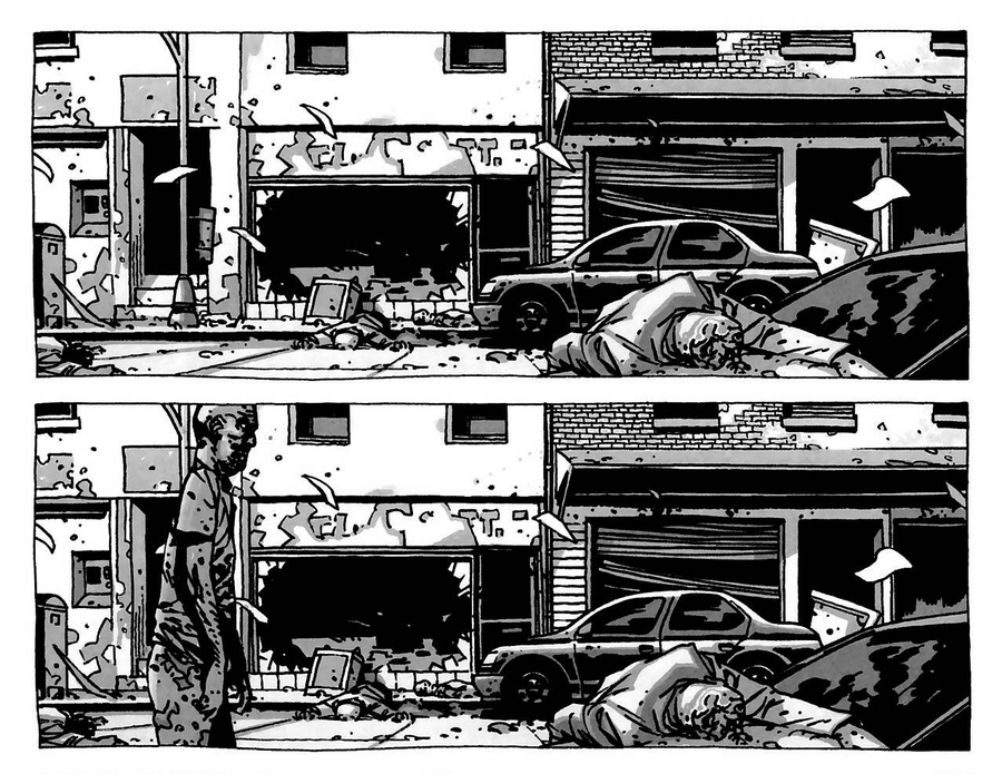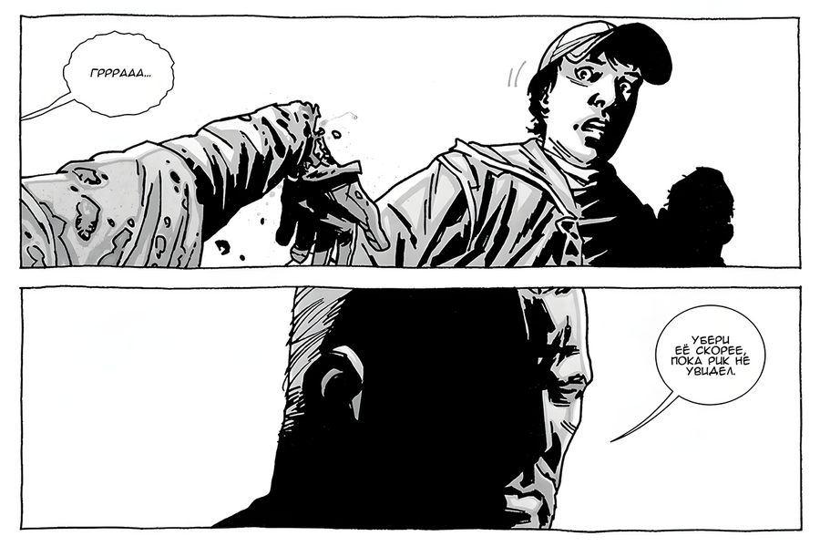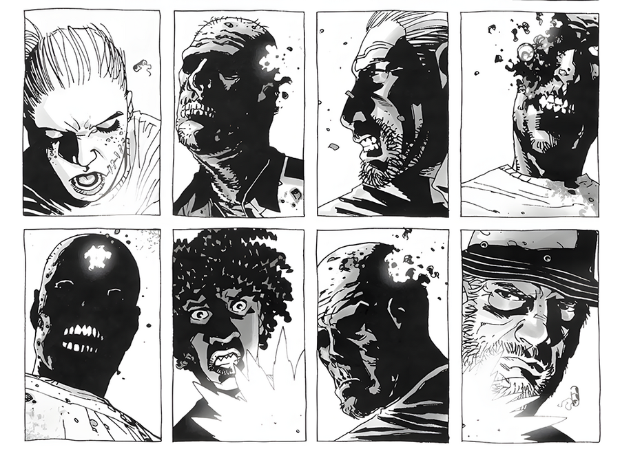 Четкая линия между правильным и неправильным существует лишь в абстрактной морали, оторванной от реальности, но не на страницах комикса. Визуальная серость происходящего становится художественной аллегорией, где нет однозначных ответов и однобоких выводов. Таким образом, «Ходячие мертвецы» представляют собой осознанный нарратив, где история и художественные технические приемы работают сообща, как хорошие сценарист и художник.