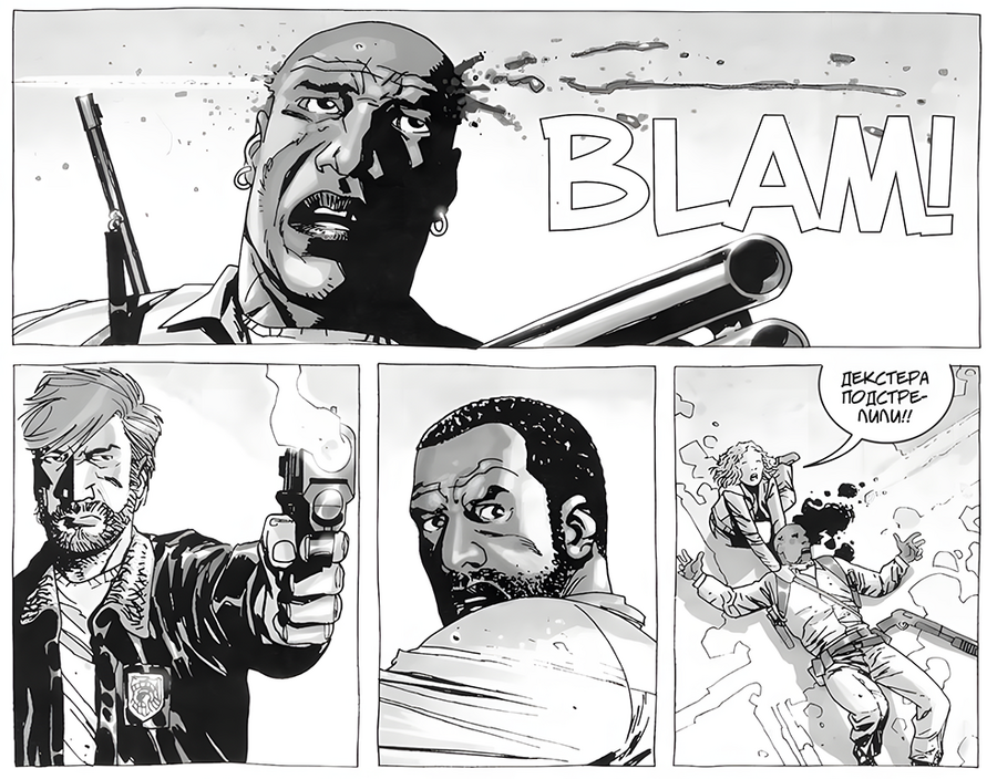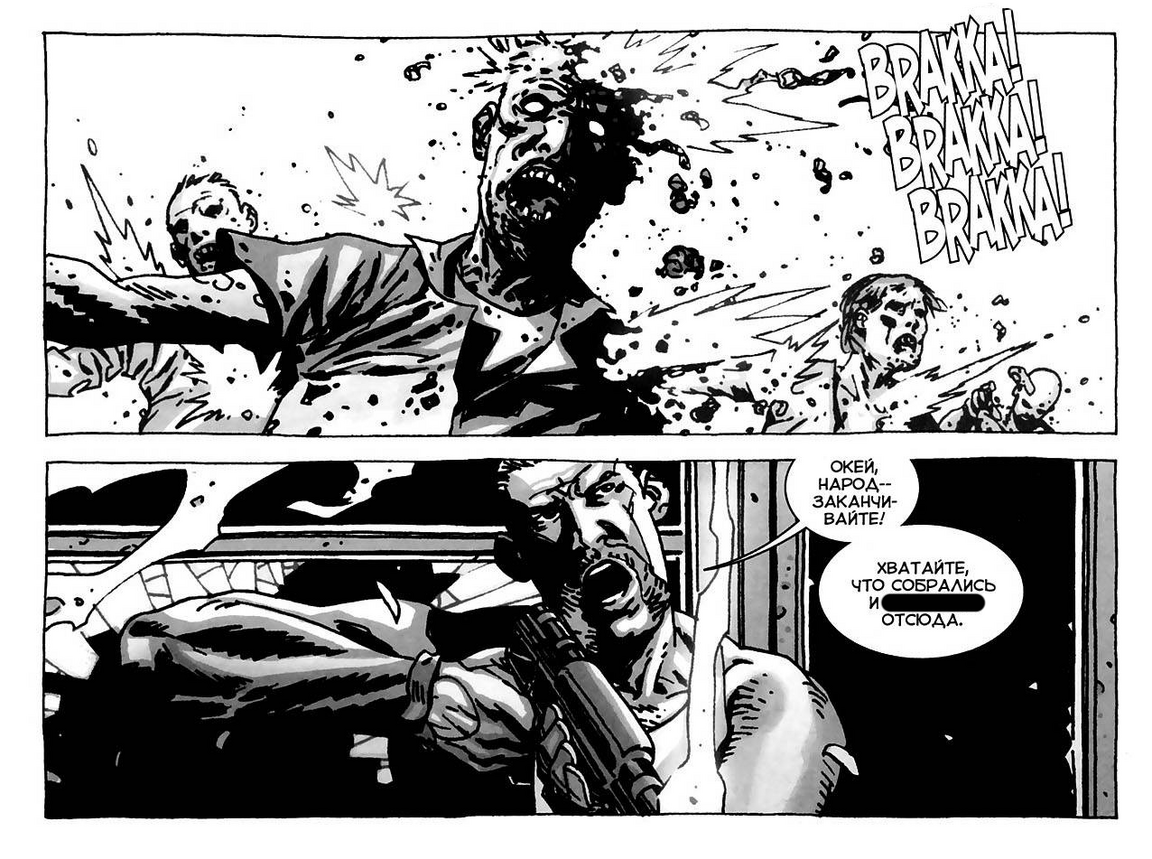 Гиперболизация в принципе один из любимых приемов в комиксе, больше об этом будет чуть далее. «Ходячие мертвецы», безусловно, не изобрели этот прием, он встречался и раньше, но пользуются им здесь умело.