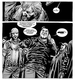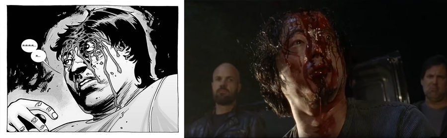 Роберт Киркман, Тони Мур «Ходячие мертвецы», 2012 г. / Грег Никотеро, Майкл Е. Сатраземис и Фрэнк Дарабонт, телесериал «Ходячие мертвецы», 2016 г. Сцена убийства Гленна