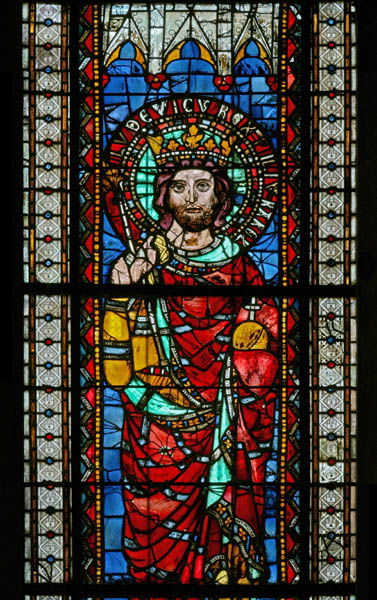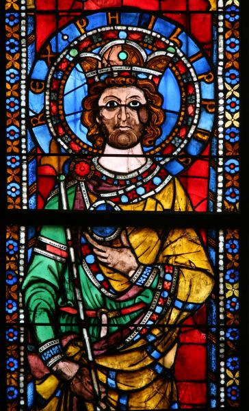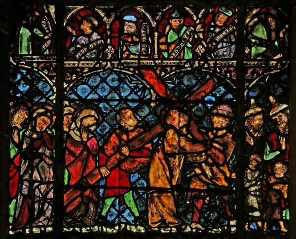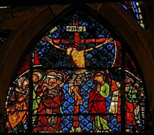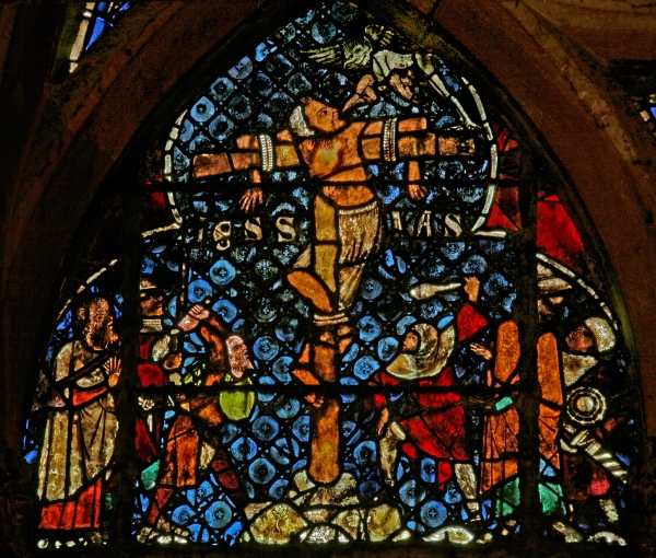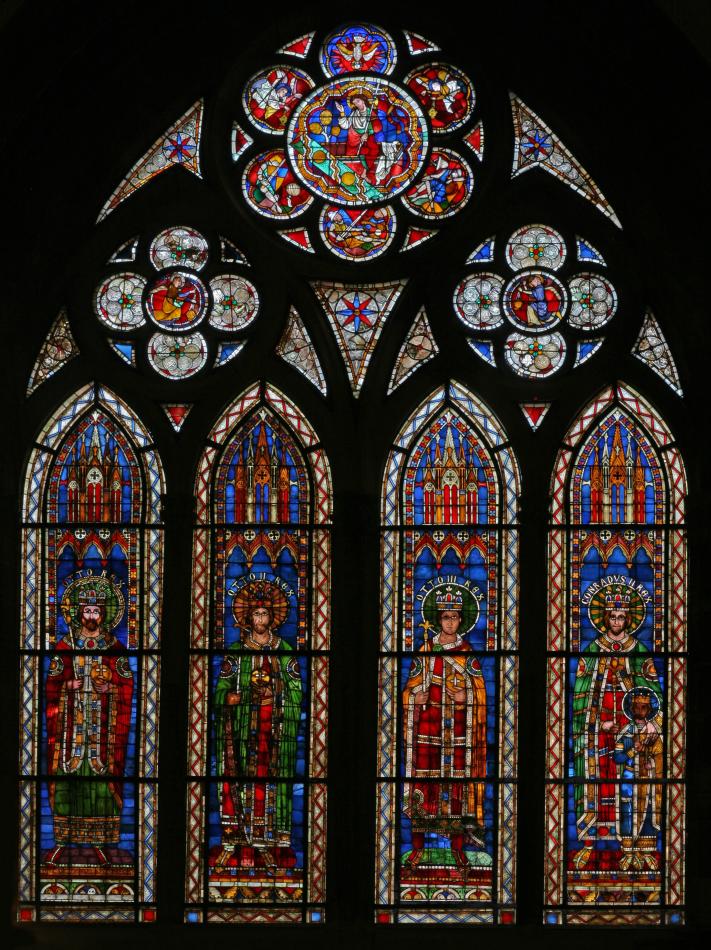 Верхняя розетка витража с тремя императорами изображает Распятие (в отличие от большинства витражей этого ряда, она относится в основном к XIX веку)