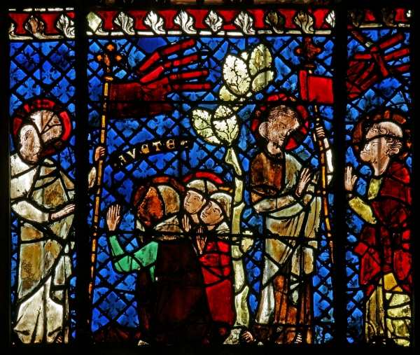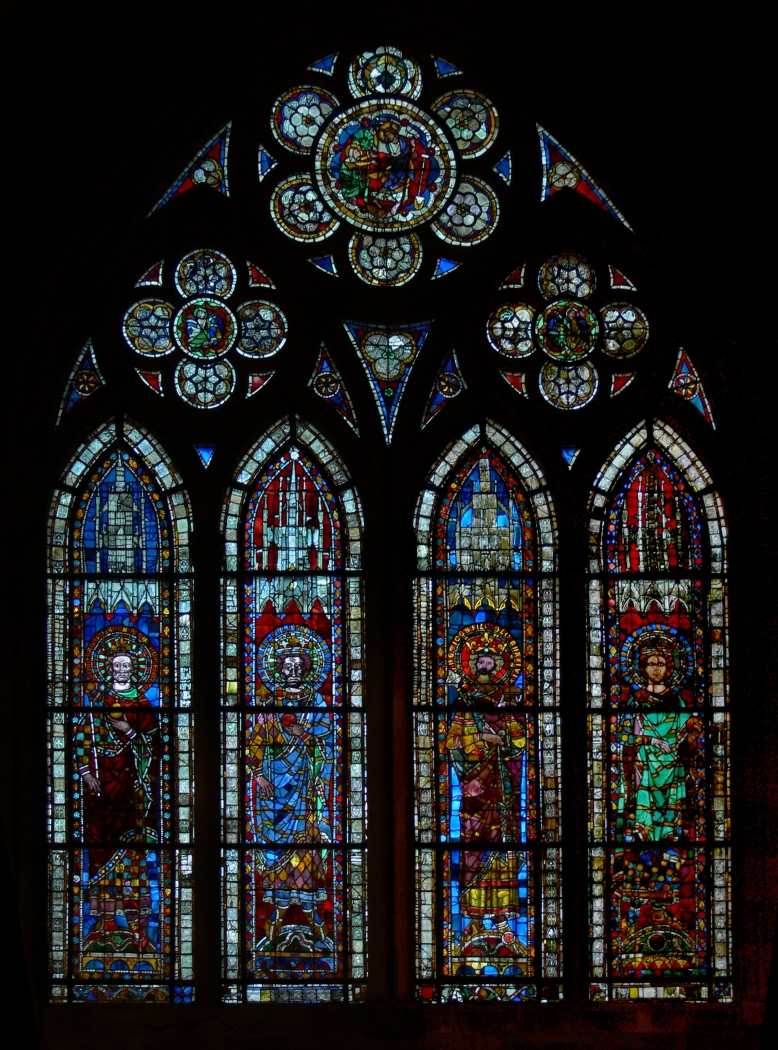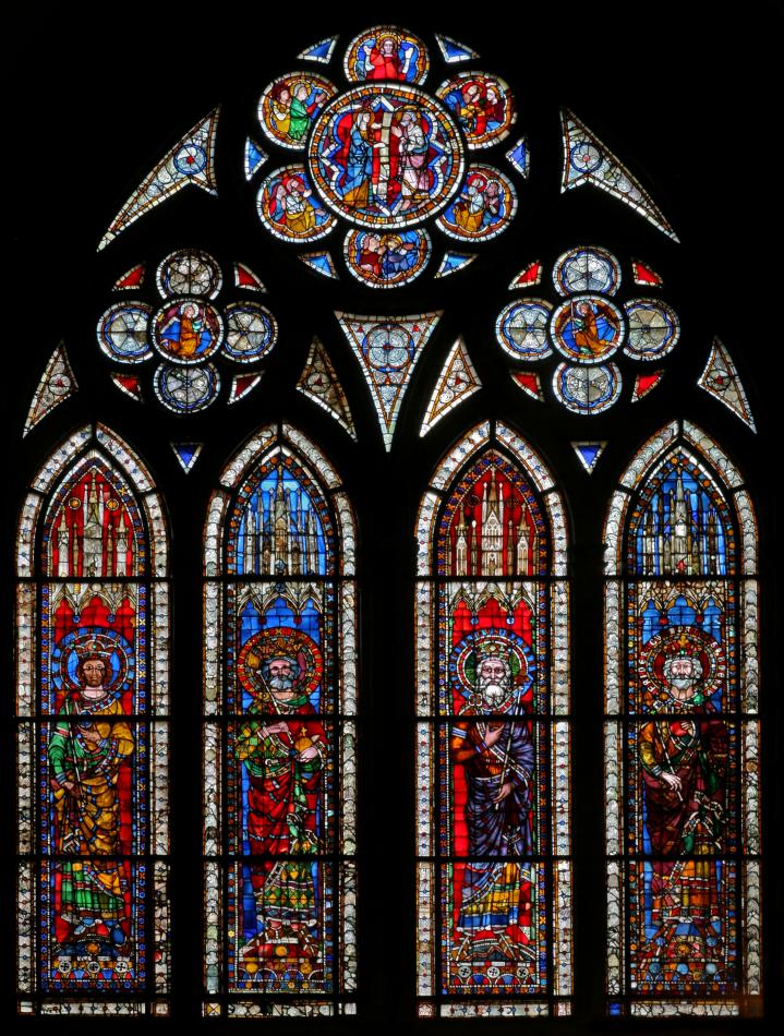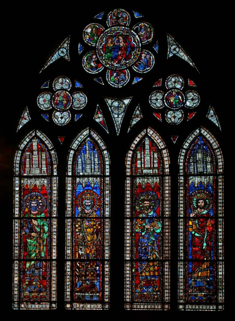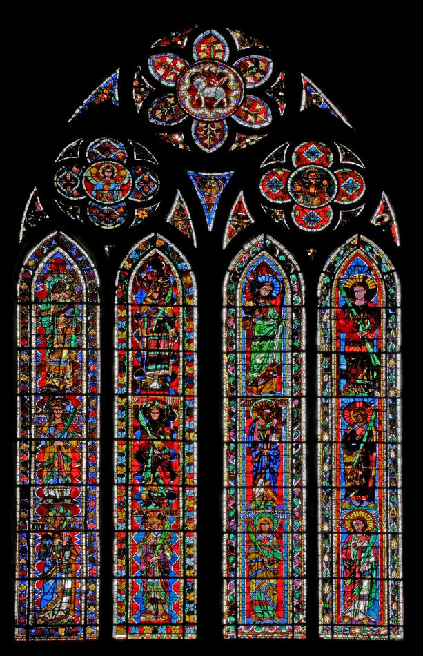 Первый (считая от хора) витраж в северном ряде окон верхнего яруса содержит изображения четырех римских пап (верхний ряд) и четырех дьяконов (нижний ряд), с суровыми бородатыми лицами