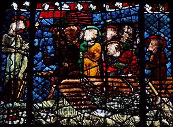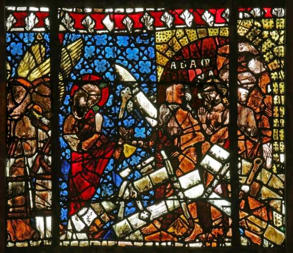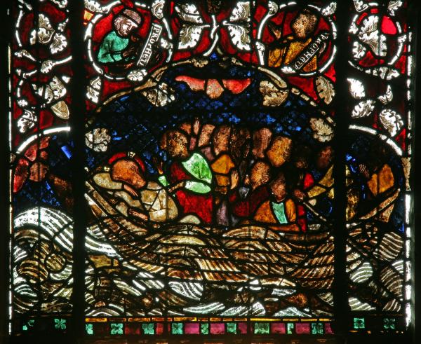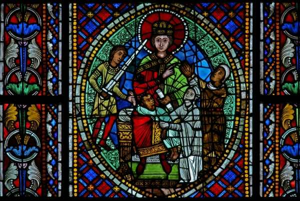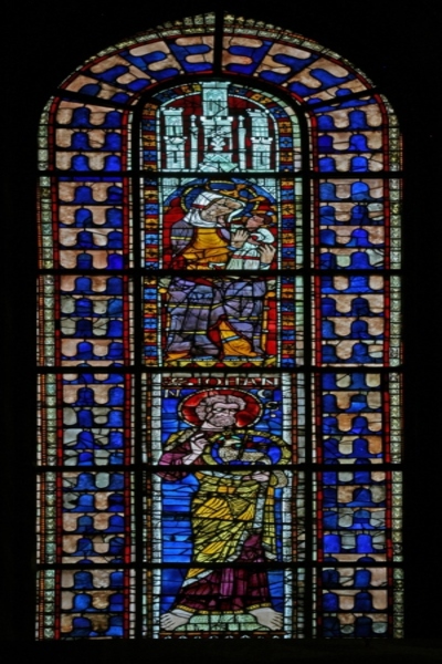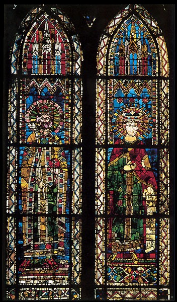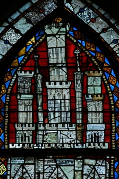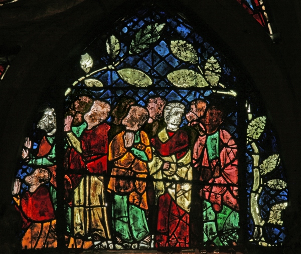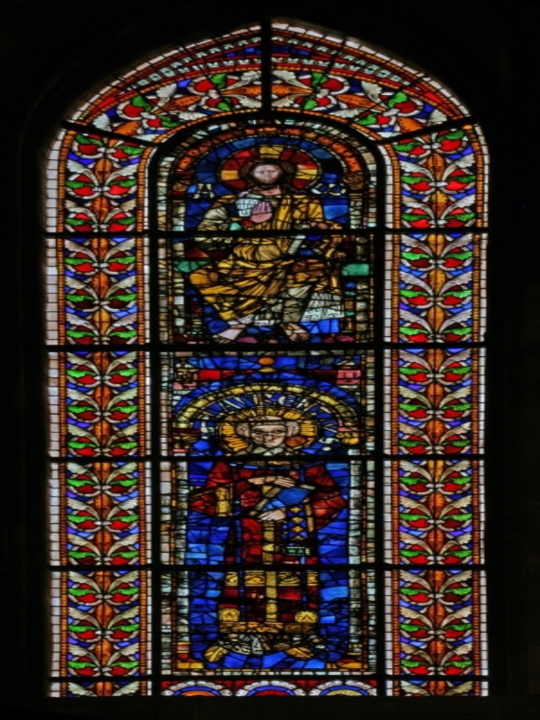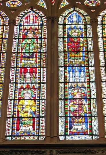 Первый (считая от хора) витраж в северном ряде окон верхнего яруса содержит изображения четырех римских пап (верхний ряд) и четырех дьяконов (нижний ряд), с суровыми бородатыми лицами