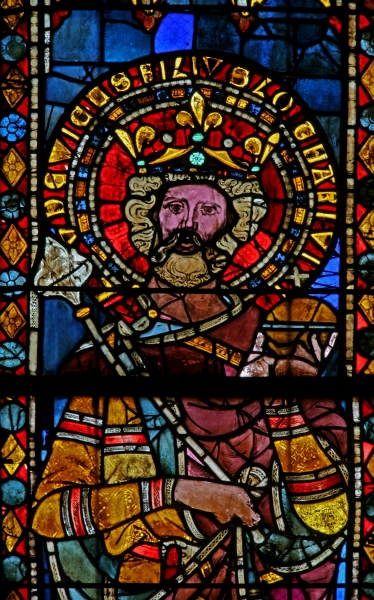 Четвертый витраж называют витражом Карла Великого. На этом витраже представлены (слева направо): Карла Мартелла (отца Пипина Короткого), затем собственно Карла Великого, Пипина Короткого и Людовика I Благочестивого. Справа — более крупное изображение Людовика I Благочестивого и деталь балдахина [3]: