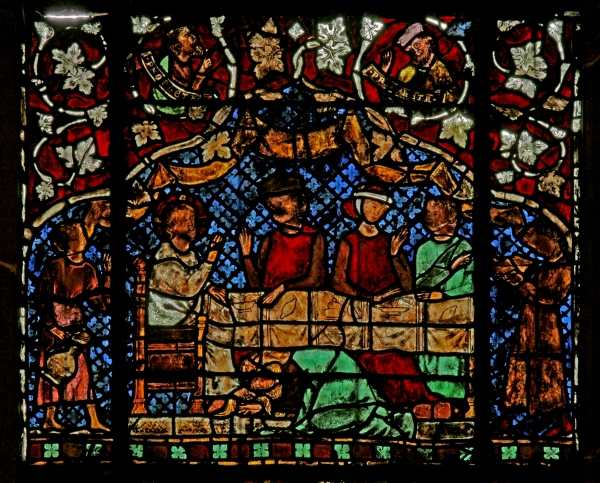 Верхняя розетка третьего витража изображает, как одна из святых жен-мироносиц сообщает о Воскресении Христа св. Петру и другим апостолам: в верхнем лепестке помещен сам Христос.