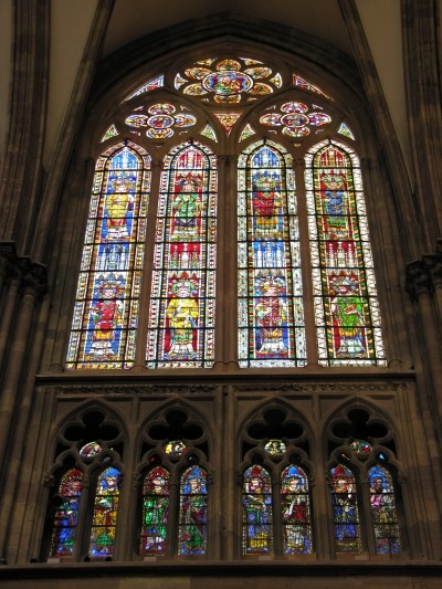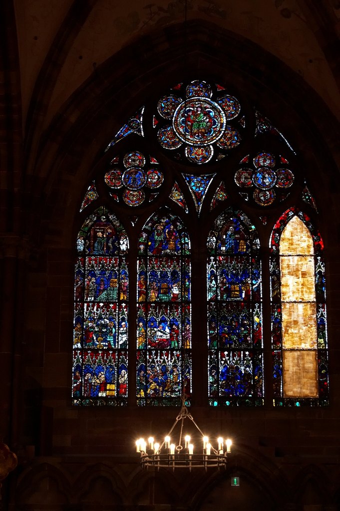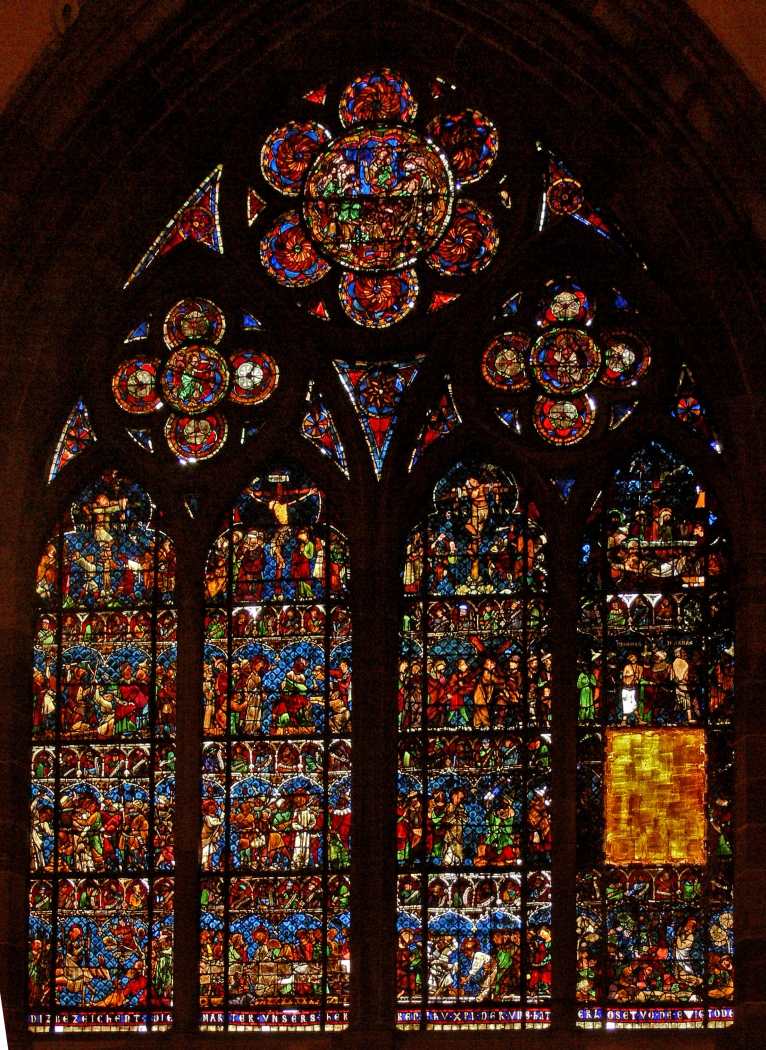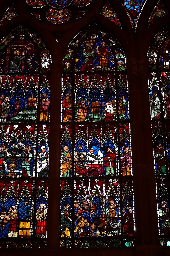Витражи для верхнего ряда окон центрального нефа в Страсбурге создавались в период между 1250 и 1275 годами. Эти витражи демонстрируют переход от так называемого «угловатого» стиля (для которого характерны резкие линии и острые углы) к зрелой готике французского образца.