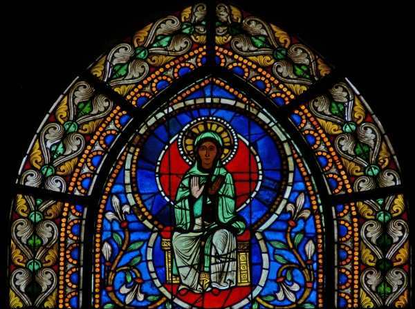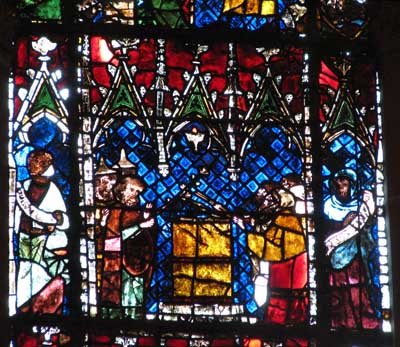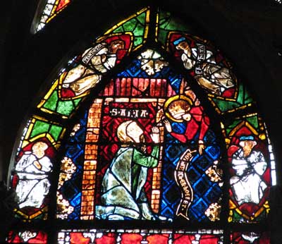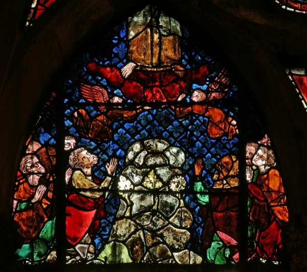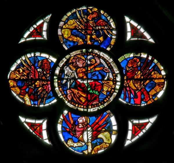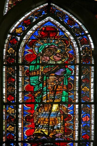 Верхняя розетка этого витражного окна изображает Успение Богородицы, две нижних — ангелов с кадилами.