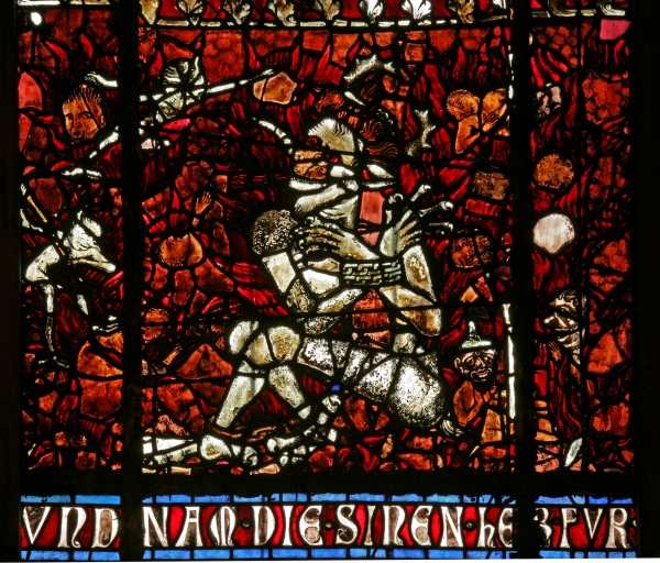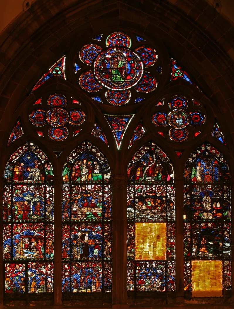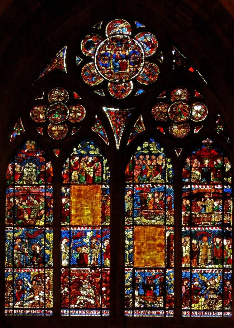 Зато остальные витражи этой части Страсбургского собора, наоборот, являются наиболее древними и очень ценными. Под розетками установлены два витражных окна, относящихся ко второй половине XII века