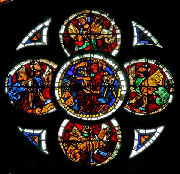 Верхняя центральная розетка этого витражного окна изображает Коронование Богородицы, две нижних — ангелов с кадилами [3].