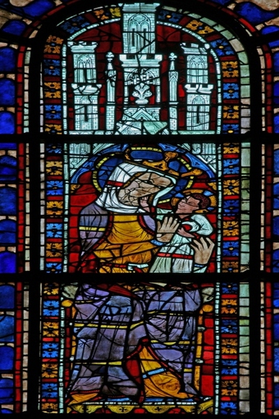 Первый (наиболее близкий к хору) витраж этого ряда называют витражом Девы Марии. В четырех проемах со стрельчатыми арками представлено 16 сюжетов (слева направо): Благовещение св. Анне; Благовещение св. Иоакиму (родителям Богородицы); Встреча (целование) у Золотых ворот; Рождение Девы Марии (верхний ряд); Введение Марии во храм; потомки Давида (сыновья от всех колен Израилевых) кладут свои жезлы на алтарь (чтобы выбрать жениха для Марии); жезл Иосифа расцветает лилиями; Обручение Марии с Иосифом (второй ряд сверху); Благовещение; Рождество Иисуса Христа; Поклонение пастухов; Поклонение волхвов (второй ряд снизу); Сретение Господне; Избиение младенцев; Бегство в Египет; Христос среди мудрецов в Храме (нижний ряд). По бордюру витраж украшают фигуры пророков.